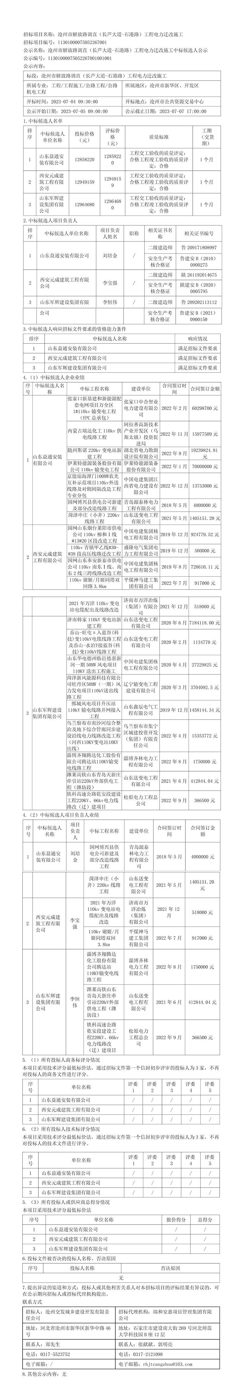 滄州市解放路調(diào)直(長(zhǎng)蘆大道-石港路)工程電力遷改施工中標(biāo)候選人公示