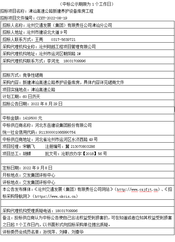 津汕高速公路新建養(yǎng)護(hù)設(shè)備庫(kù)房工程中標(biāo)公告