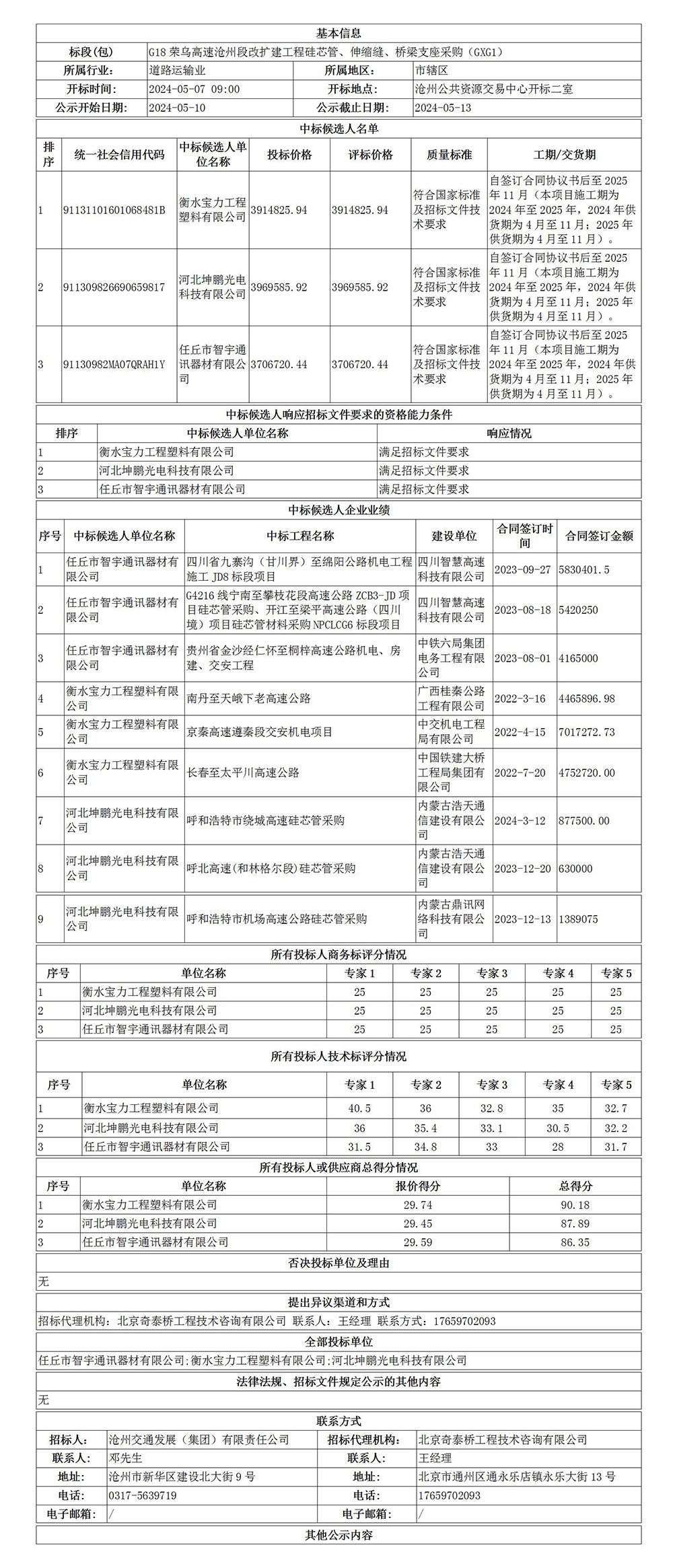 G18榮烏高速滄州段改擴建工程硅芯管、伸縮縫、橋梁支座采購(GXG1)中標(biāo)候選人公示