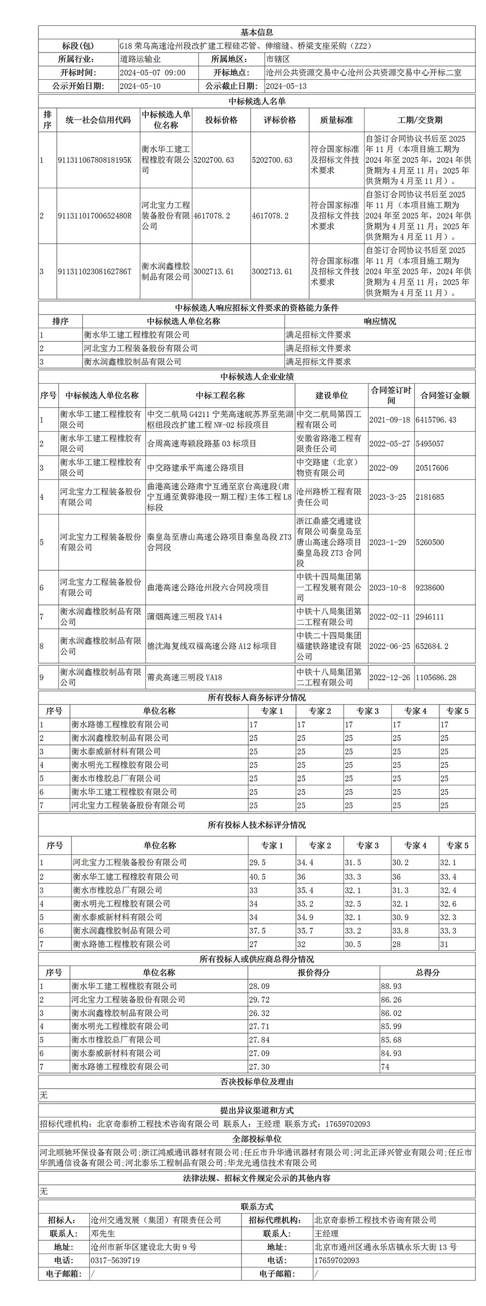 G18榮烏高速滄州段改擴建工程硅芯管、伸縮縫、橋梁支座采購(ZZ2)中標候選人公示