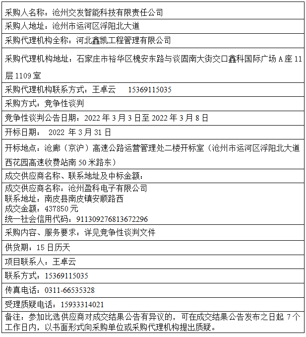 滄州高速公路稽查稽核系統(tǒng)設(shè)備采購安裝項目 成交結(jié)果公告